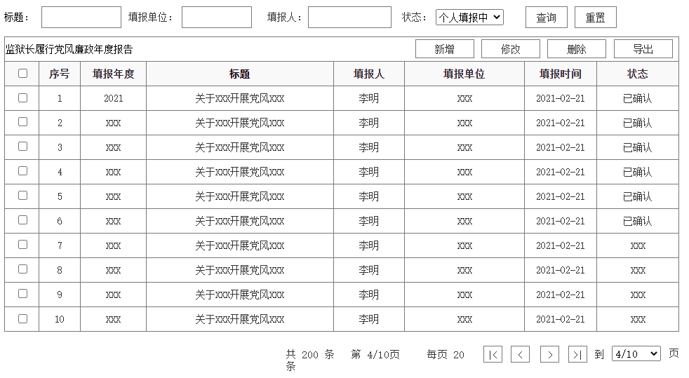 對(duì)監(jiān)獄單位日常開展監(jiān)督等情況的記錄以及日常工作數(shù)據(jù)的報(bào)告,系統(tǒng)能自動(dòng)對(duì)更監(jiān)獄單位的日常監(jiān)督數(shù)據(jù)進(jìn)行匯總。