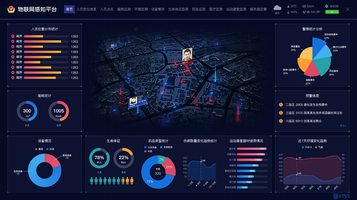 以萬物互聯(lián)為基礎,建設物聯(lián)感知平臺,通過系統(tǒng)數(shù)據(jù)對接、電子標簽、電子腕帶、藍牙傳感器等物聯(lián)網(wǎng)技術,對戒毒人員區(qū)域管控信息、心理咨詢和運動康復場數(shù)據(jù)進行自動采集匯聚,對所內(nèi)相關設施設備的運行狀態(tài)和過程數(shù)據(jù)、環(huán)境數(shù)據(jù)信息進行智慧化感知。