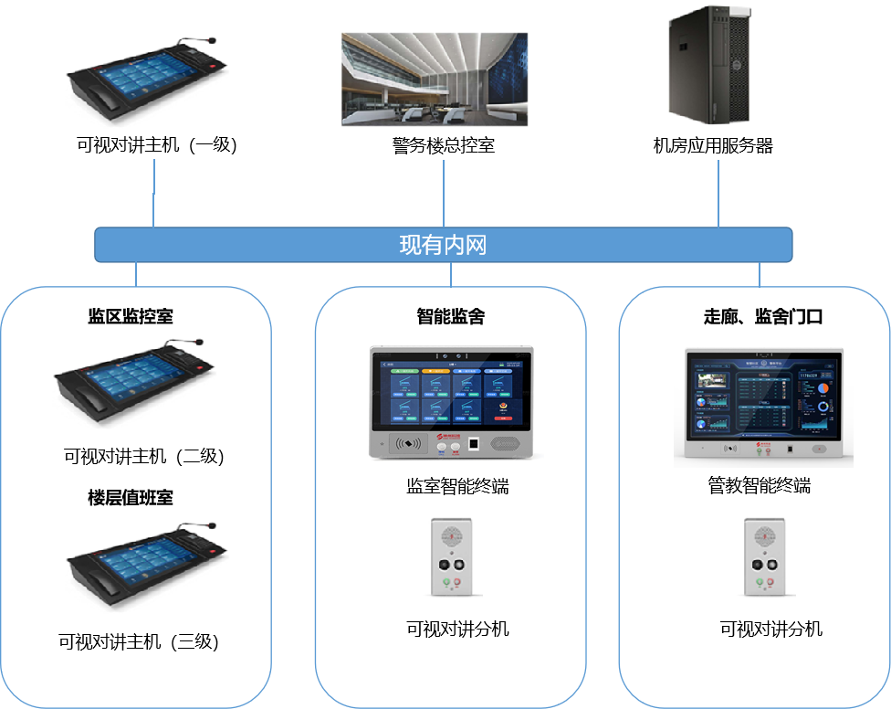 神州監(jiān)室智能終端系統(tǒng)基于局域網(wǎng)LAN和廣域網(wǎng)WAN傳輸技術(shù),采用自主知識產(chǎn)權(quán)的音視頻核心技術(shù),充分考慮在押人員、管教民警、監(jiān)所管理人員的實際使用及管理需求,智能的將監(jiān)舍、值班室、監(jiān)區(qū)、總控室各級設(shè)備聯(lián)網(wǎng)管理。